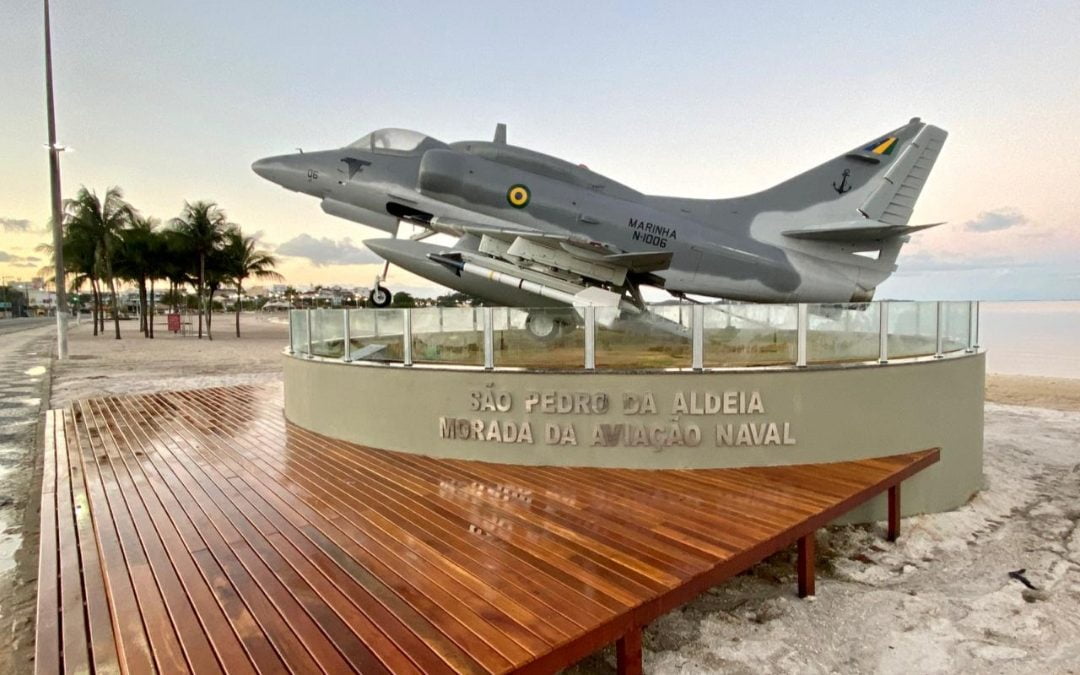 A cidade de São Pedro da Aldeia, no estado do Rio de Janeiro, realizou ontem (23) a inauguração de um monumento em homenagem à aviação naval, tendo como base um caça bombardeiro AF-1 Falcão da Força Aeronaval da Marinha Brasileira, cedido pela Base Aérea Naval de São Pedro da Aldeia (BAeNSPA).