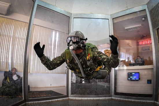 O Salto em queda livre de um paraquedista militar requer treinamento constante. Uma forma de manter seu adestramento em dia é o uso de simuladores, outra modalidade utilizada no Adestramento Conjunto de Salto Livre Operacional para Forças Especiais, que acontece até esta sexta-feira (25).