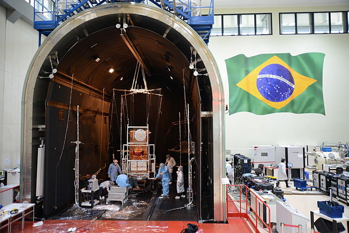 Foi realizado este mês o teste de termovácuo do modelo de voo do satélite Amazônia 1. Durante o ensaio, são simuladas as condições do ambiente espacial, em termos de temperatura e pressão & a carga térmica, em termos de radiação absorvida pelas superfícies do satélite, quando em órbita.