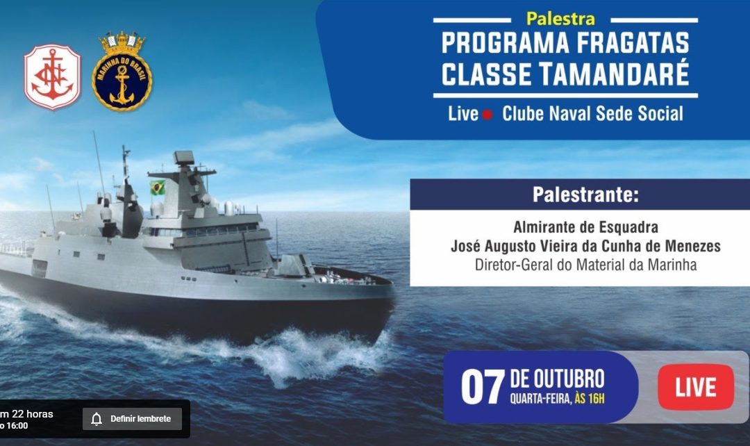 Nesta quarta-feira (7), o Clube Naval, em parceria com a Diretoria-Geral do Material da Marinha, promoverá a palestra on-line: “Programa Fragatas Classe Tamandaré”. O tema será explanado pelo Diretor-Geral do Material da Marinha, Almirante de Esquadra José Augusto Vieira da Cunha de Menezes.