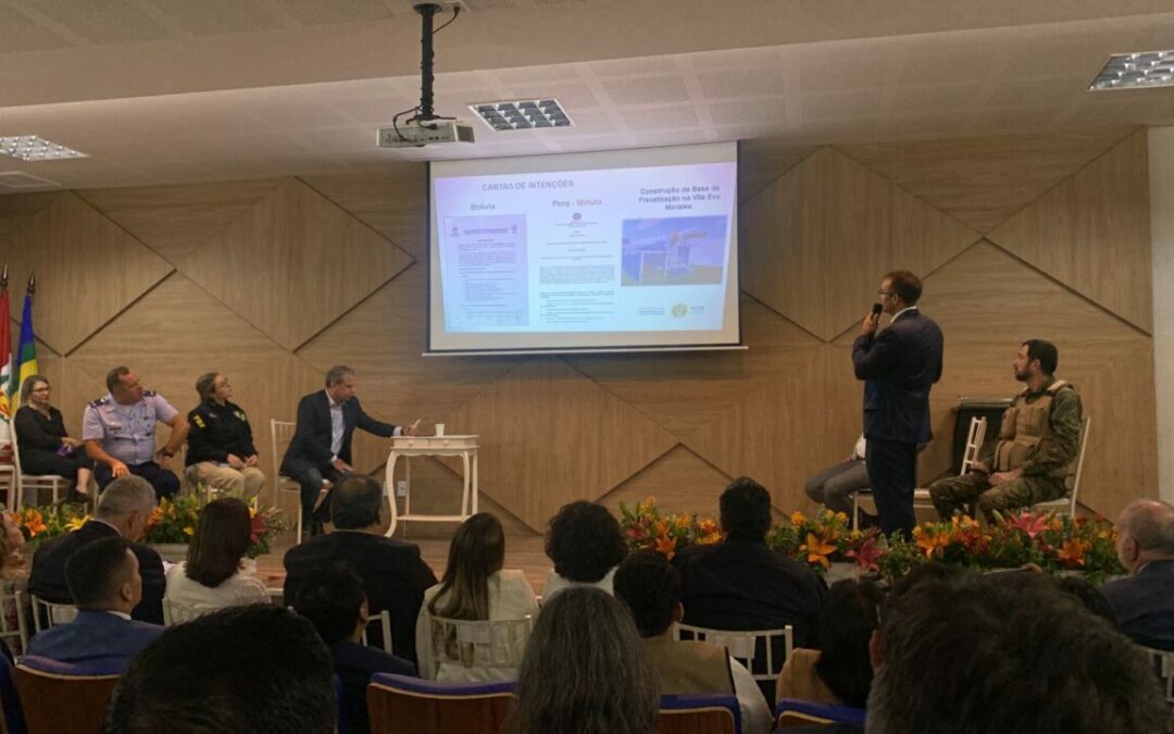 Com a participação de governadores, secretários de Estado e autoridades de Segurança Pública , que atuam nas regiões de fronteiras da região Norte, aconteceu na última sexta-feira (19), o seminário de Segurança nas Fronteiras, juntamente com o Ministério da Justiça. O evento foi realizado na fronteira entre Brasil, Bolívia e Peru, no município de Brasiléia, no Acre. No evento foram discutidos projetos que visam a implementação do Sistema Único de Segurança Pública (Susp), destacando a necessidade de integração das forças Federais, Estaduais e Municipais, com o objetivo de trazer resultados efetivos no combate ao tráfico de entorpecentes. O Governo de Rondônia foi representado pelo secretário de Estado da Segurança, Defesa e Cidadania – Sesdec, Felipe Vital que na oportunidade apresentou a atuação do estado sobre o referido tema.