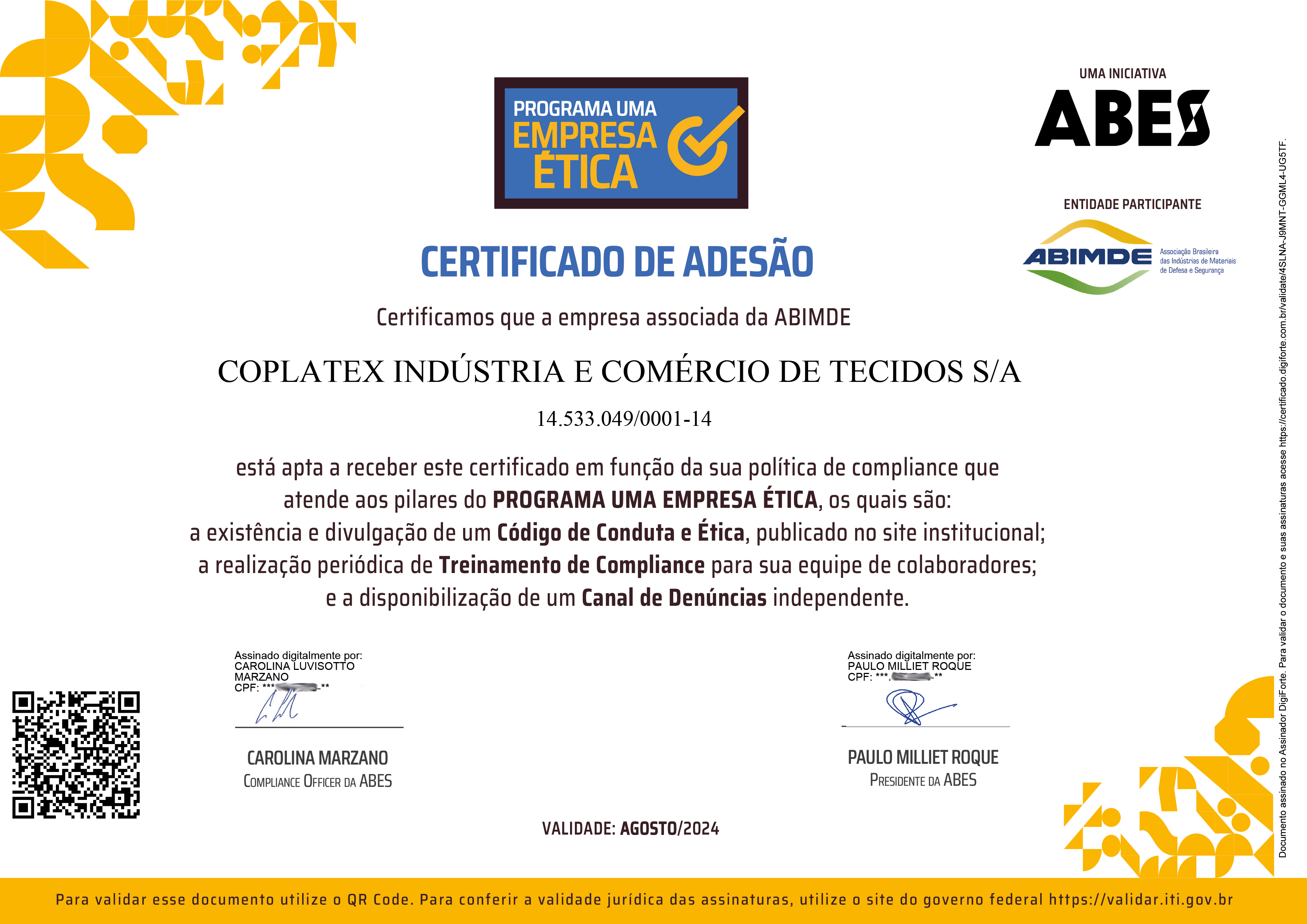 A empresa brasileira Protecta Defesa & Segurança foi certificada pela ABES (Associação Brasileira das Empresas de Software) com o selo “Uma Empresa Ética” por meio do programa promovido em parceria com a ABIMDE (Associação Brasileira das Indústrias de Materiais de Defesa e Segurança).