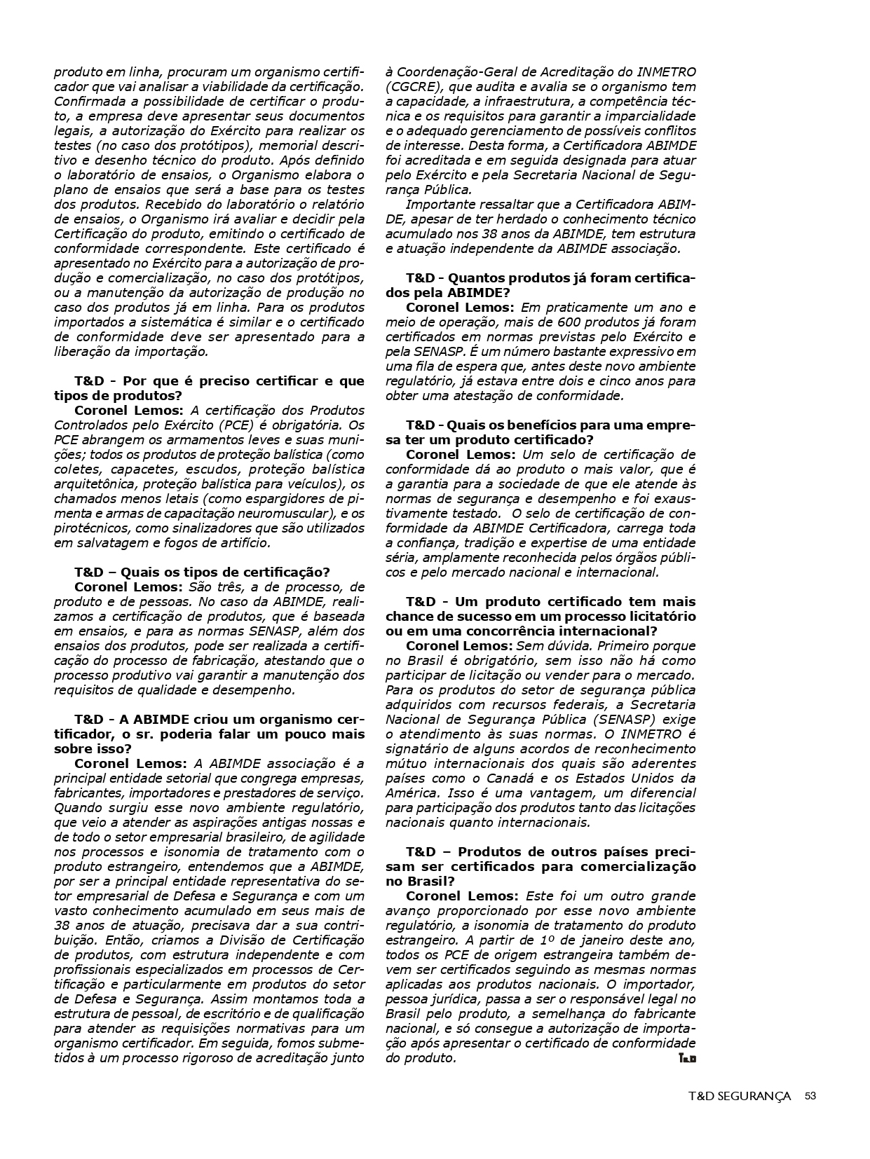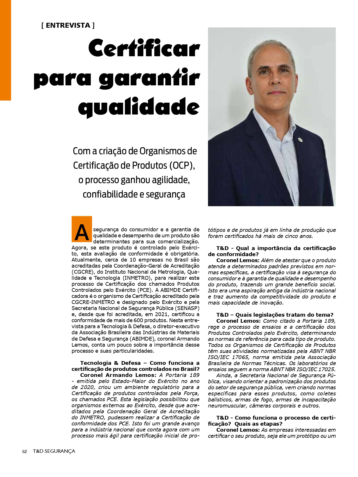 Em entrevista para a edição especial da Tecnologia & Defesa, o diretor-executivo da ABIMDE, Coronel Armando Lemos, falou sobre o processo de certificação de produtos controlados, além de outras particularidades sobre a atividade.