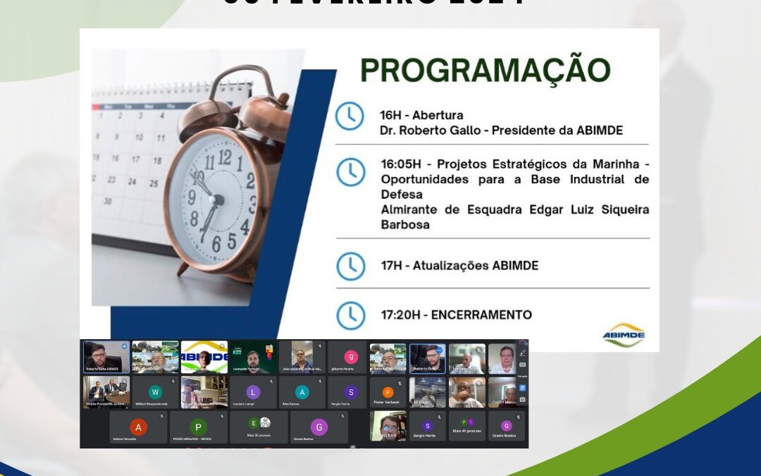 No último dia 06 de fevereiro, a Associação Brasileira das Indústrias de Materiais de Defesa e Segurança (ABIMDE) realizou a segunda reunião plenária de 2024. Mais uma vez a programação privilegiou o formato on-line, com participação de associadas e convidados e contou com apresentação da Marinha do Brasil.