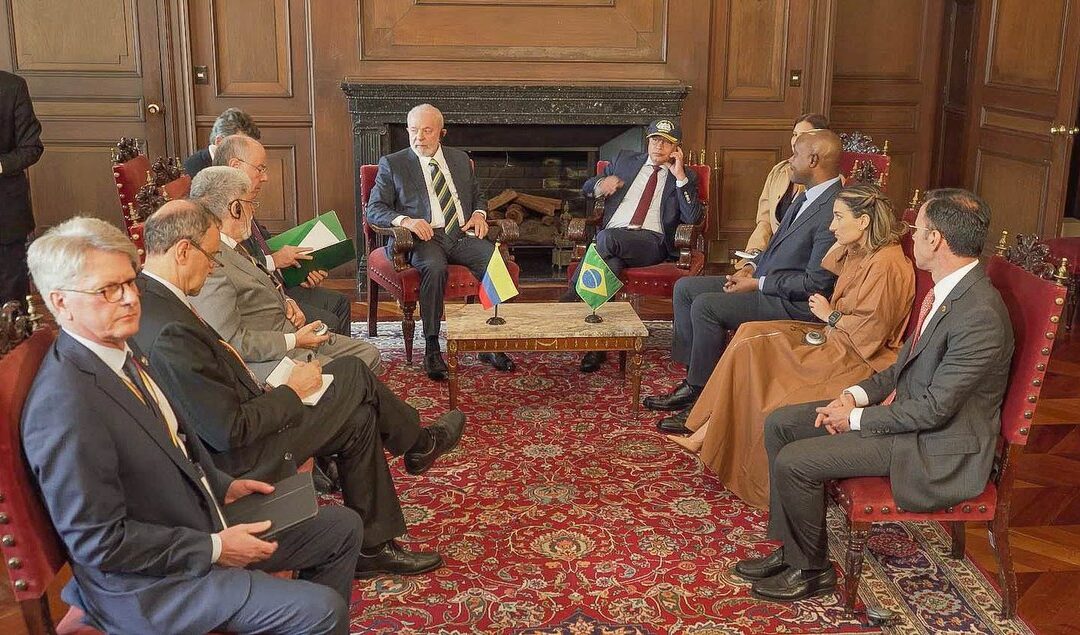 O estabelecimento de parcerias estratégicas e transferência de tecnologia foram temas discutidos em encontro realizado nesta quarta-feira (17), durante reunião bilateral entre o presidente Lula e o presidente colombiano, Gustavo Petro, em Bogotá, capital da Colômbia. O Ministério da Defesa foi representado, na reunião restrita com os presidentes, pelo Secretário-Geral da pasta, Luiz Henrique Pochyly. Participaram do encontro, ainda, o Ministro das Relações Exteriores, embaixador Mauro Vieira, e o Assessor Especial da Presidência da República, embaixador Celso Amorim.