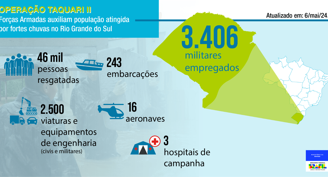 O trabalho integrado de militares e civis no auxílio às vítimas das enchentes no Rio Grande do Sul resultou, até o momento, no resgate de 46 mil vidas. Com um contingente de 3.400 militares da Marinha, Exército e Aeronáutica, além de 15 helicópteros, um avião de carga, 243 embarcações e 2.500 viaturas e equipamentos de engenharia (civis e militares), as Forças Armadas atuam na região desde o dia 30 de abril.